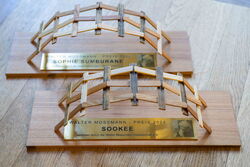 Zu Ehren des Brückenbauers Walter Mossmann eine Leonardo-Brücke, Idee und Umsetzung Andreas Hagedorn und Christiane Möller, Materialien: Kirsche vom Kaiserstuhl, Rüster, (aussterbende) Ulmen-Art aus dem Taubergießen, Eiche und Buche aus dem Elsass und der Rheinebene. Trägerplatte: Brett vom 1975 besetzten AKW-Bauplatz in Kaiseraugst, Schweiz, das die WMG als Spende erhalten hatte.